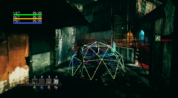 .45 PARABELLUM BLOODHOUND se autodenomina como “Active Time Action” el cual es una mecánica inspirada en el gran juego de culto de SquareSoft (Ahora Square Enix), Parasite Eve, esta mecánica consiste en una barra de acción determinada por las estadísticas del personaje y sus armas pero mientras se llena esa barra deberás moverte y esquivar el ataque de los enemigos en un área predeterminada, una vez llena tu barra de acción se detendrá el tiempo y podrás planificar como atacar a cada tipo de enemigo con el que te enfrentes.